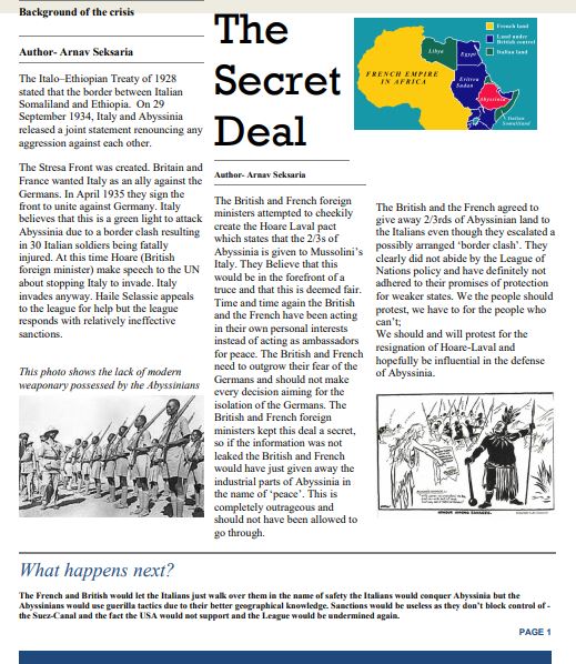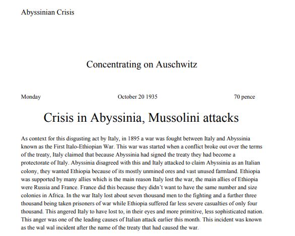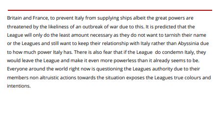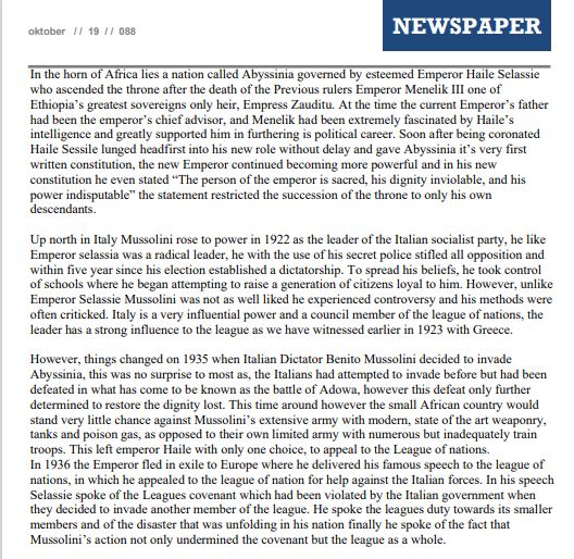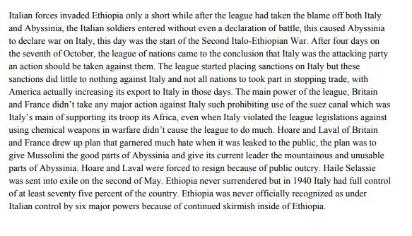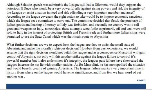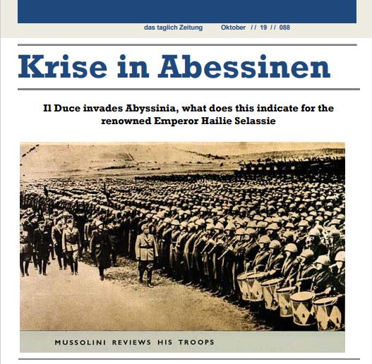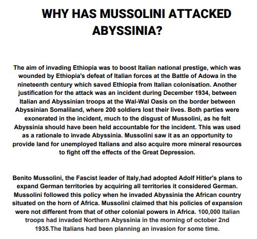 The Abyssinian crisis was a diplomatic crisis that took place between 1934 and 1937 over Italy’s policy of aggression against Ethiopia. It originated as a result of the “Walwal incident” of November 22, 1934, which marked an acceleration of the ongoing conflict between the Kingdom of Italy and the Empire of Ethiopia (then known as “Abyssinia” in Europe). It had the direct effect of undermining the credibility of the League of Nations and encouraging fascist Italy to ally itself with Nazi Germany. The crisis had contributed to the lack of peace in Europe through the progressive constitution of two opposing sides.